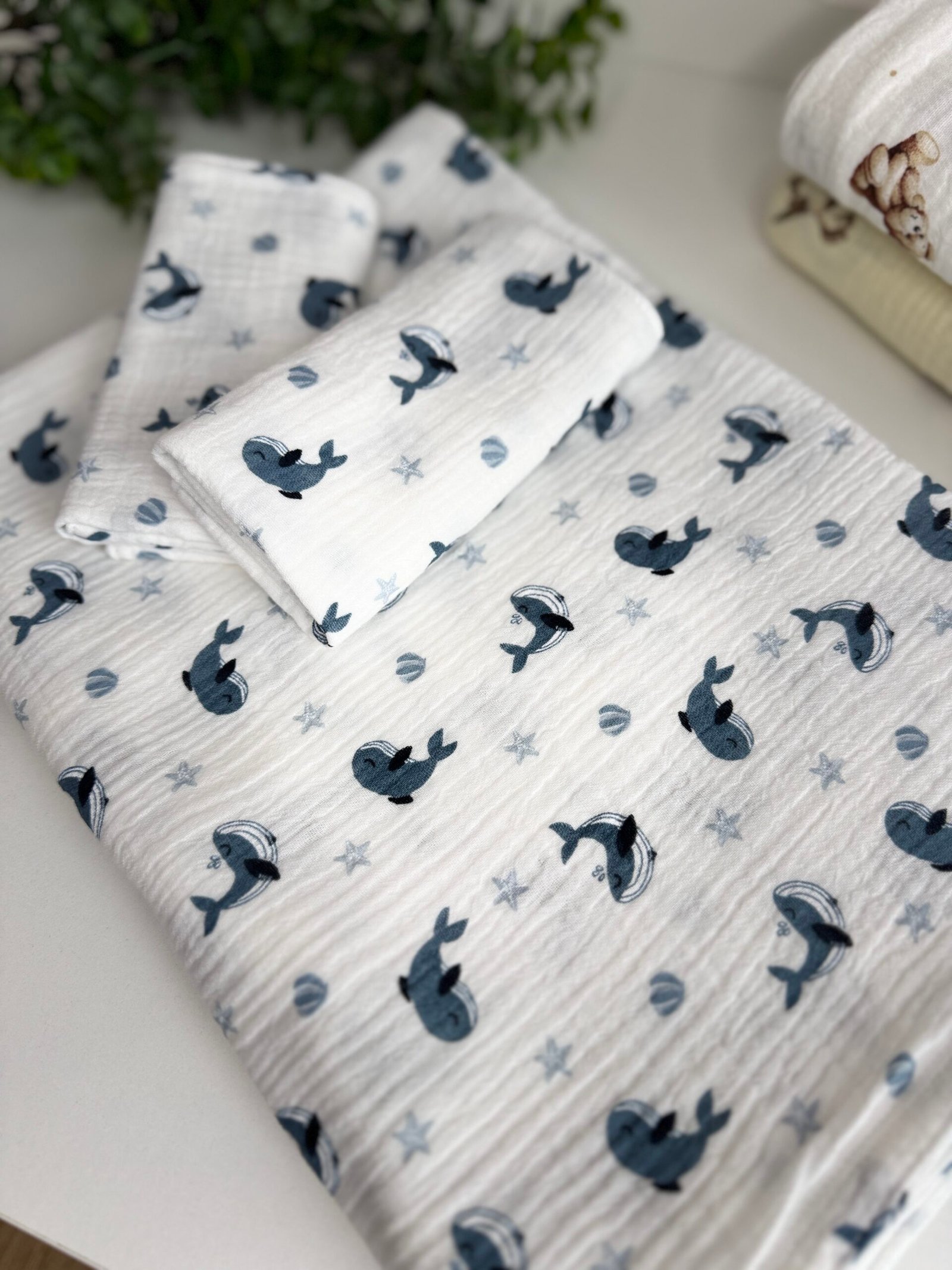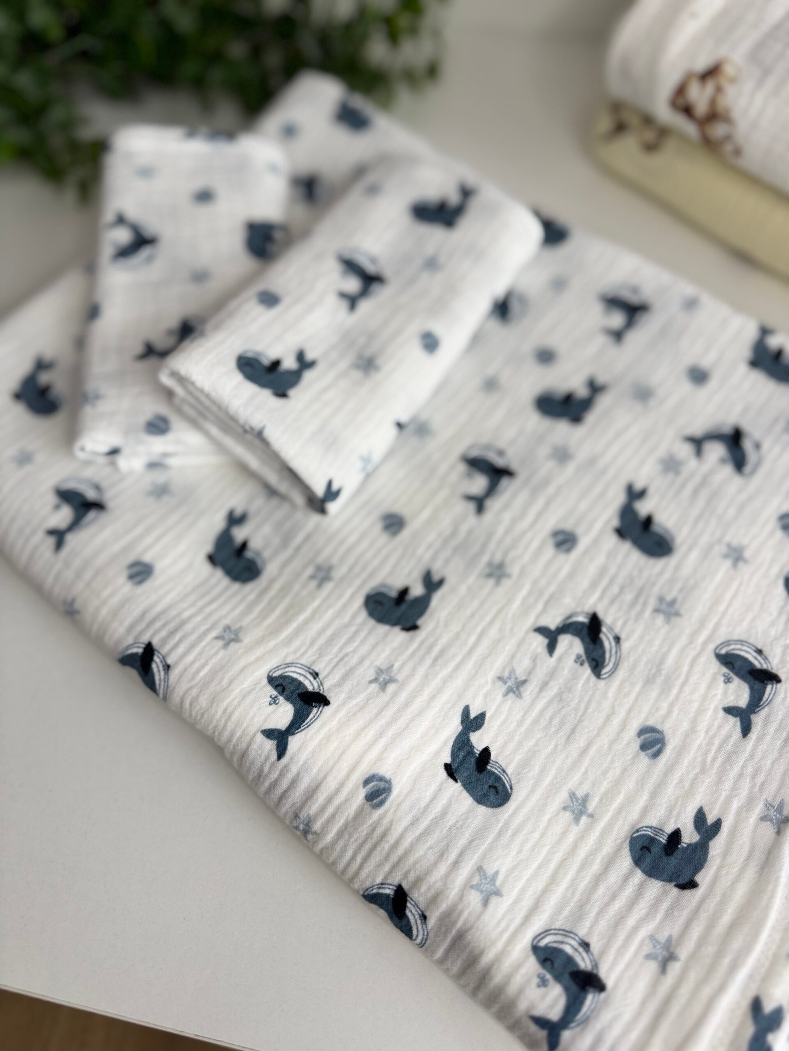 Muslino rinkinys Banginiai yra nepakeičiamas pagalbininkas tiek kūdikiams, tiek jų tėveliams. Pagaminti iš itin švelnios, bet tvirtos medvilnės, šie pledai puikiai tinka kasdieniam naudojimui ir užtikrina maksimalų komfortą. Muslinas, savo švelnumu ir orui pralaidumu, yra idealus audinys, kuris nesukelia dirginimo net jautriausiai kūdikio odai.