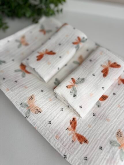Muslino pledas ir du tokio pačio rašto merliukai – tai praktiškas, patogus ir švelnus pasirinkimas jūsų kūdikiui.
