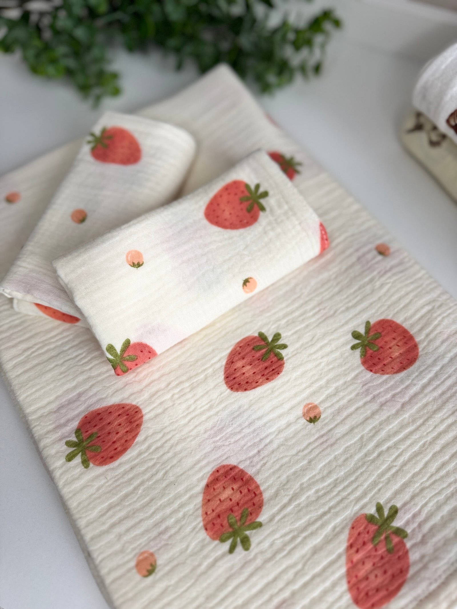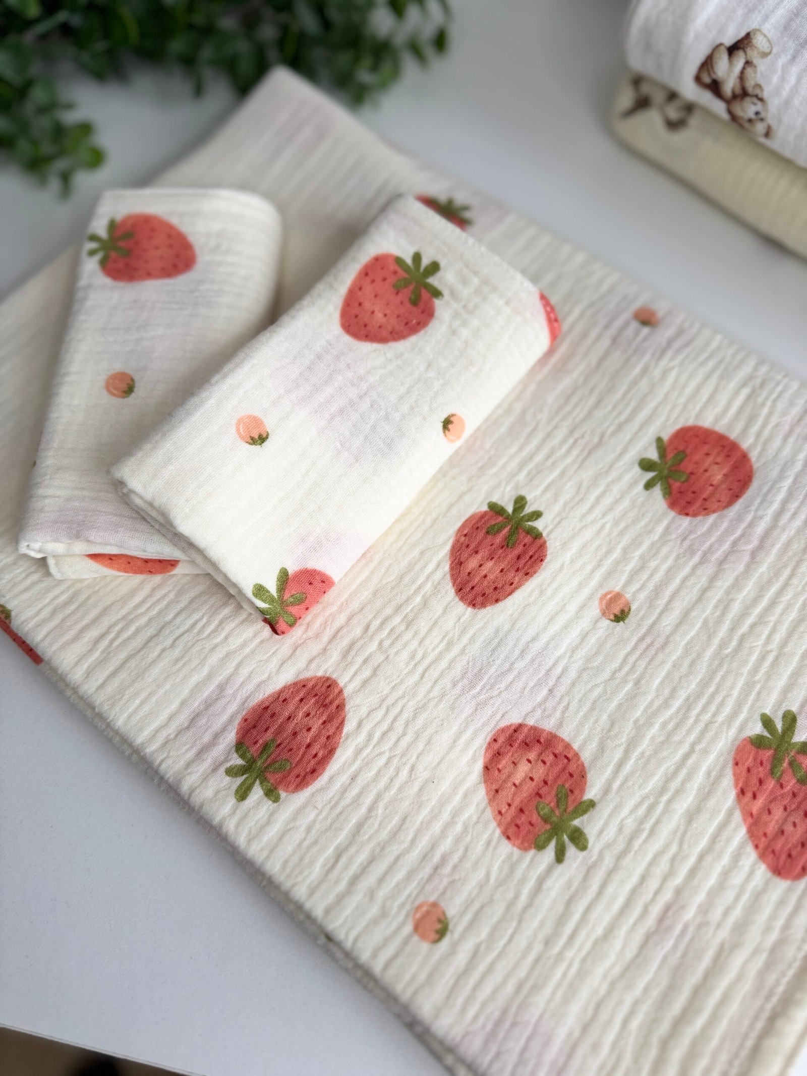 Muslino rinkinys Braškės yra nepakeičiamas pagalbininkas tiek kūdikiams, tiek jų tėveliams. Pagaminti iš itin švelnios, bet tvirtos medvilnės, šie pledai puikiai tinka kasdieniam naudojimui ir užtikrina maksimalų komfortą. Muslinas, savo švelnumu ir orui pralaidumu, yra idealus audinys, kuris nesukelia dirginimo net jautriausiai kūdikio odai.